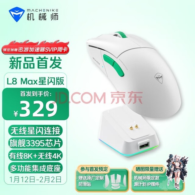 机械师 L8系列游戏鼠标 4K星闪连接 人体工学轻量化 旗舰3395芯片 支持磁吸座充 电竞办公笔记本电脑鼠标 【L8Max套装版】三模星闪4K-白色