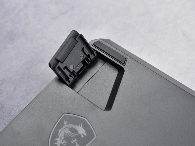 微星经典龙盾logo和MSIlogo设计在底部左侧较大区域,支撑脚为三段式可调设计,支撑0°、3°、7°用户可根据自己的习惯进行角度调整。