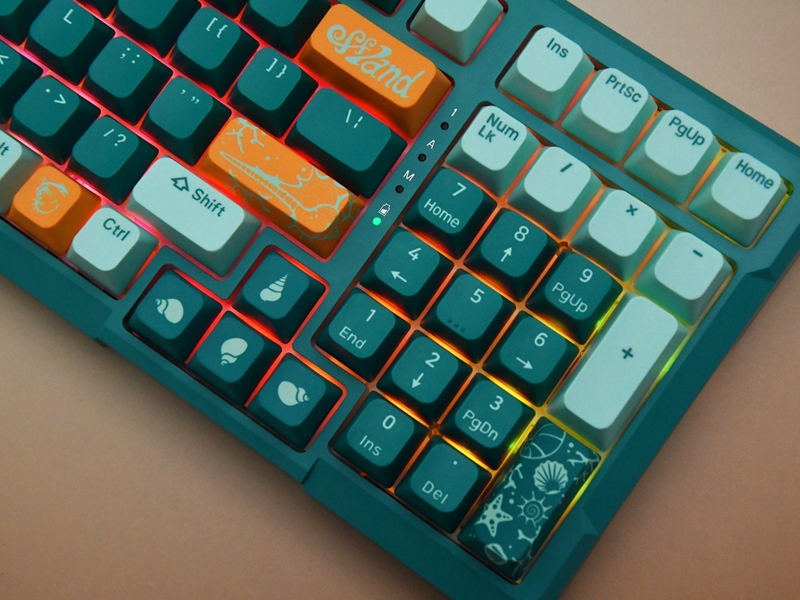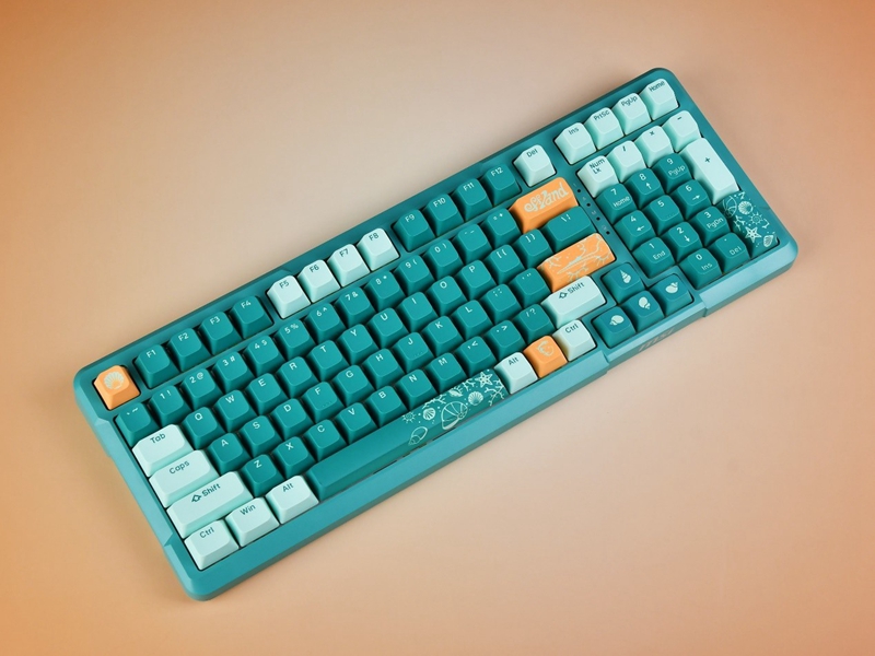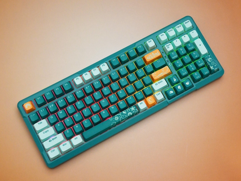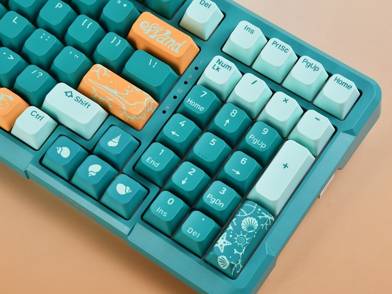 微星 GK500 WIRELESS三模无线机械键盘在配色上提供了白鲨和浮潜两种选择,本次评测的浮潜配色采用了浅绿色和深绿色的搭配,整体的色彩明快,再辅以橙色的点缀,营造出清新脱俗的视觉感受。
