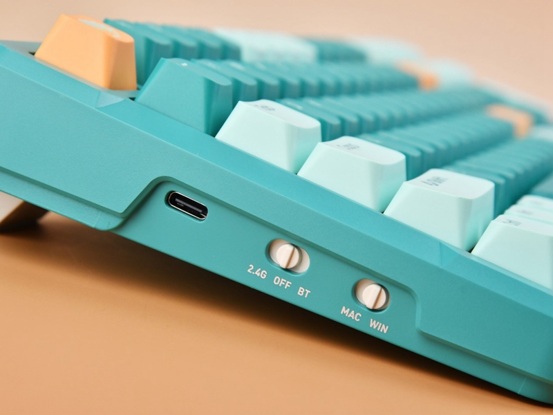 这款键盘在左侧设计了USB-C接口,2.4G/蓝牙切换开关以及Windows/macOS切换键,方便用户使用不同的模式以及连接不同的设备,右侧则是2.4G接收器的收纳仓。键盘底部在四个角设置了硅胶防滑脚垫,并有折叠式撑脚,提供了两段高度可调。