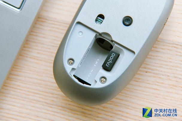 鼠标底面则分布着电源开关、蓝牙/2.4G切换键和电池/接收器仓。打开电池仓,我们可以看到2.4G接收器安静的躺在里面。这款鼠标使用一节5号AA电池供电,厂家贴心的随鼠标附赠了一节,不用自己费神寻找。据官网称,一节电池壳供鼠标使用高达9个月。