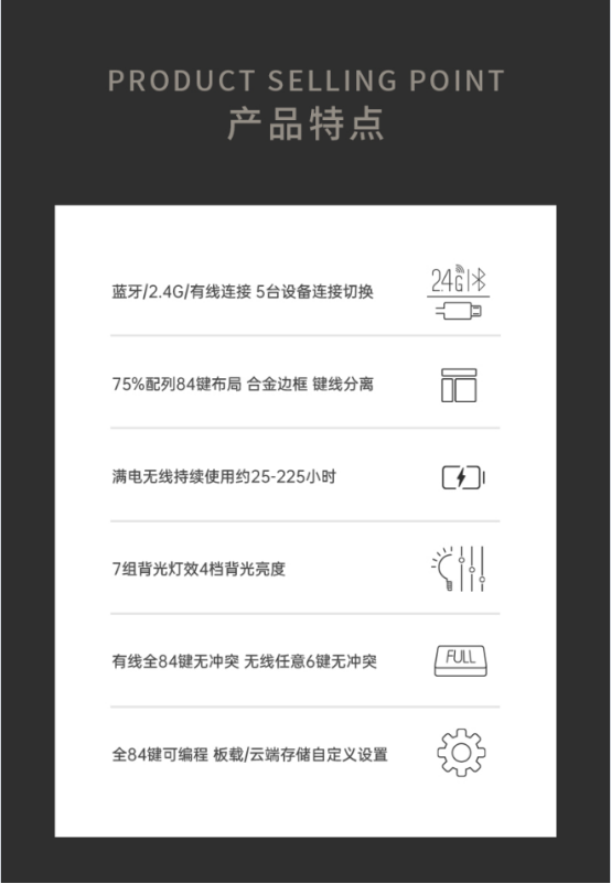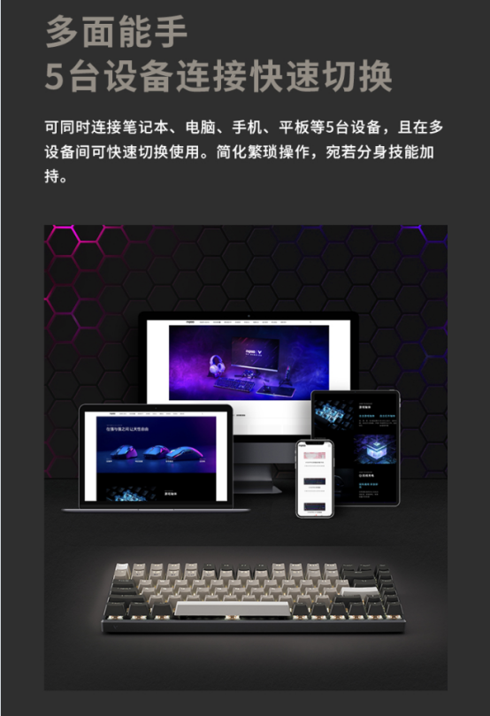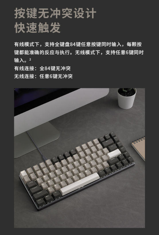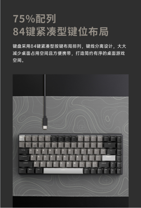 作为雷柏 V700-8A无人区的特点之一,75%的配置和84键紧凑的键位布局大大降低了桌面的占用空间,便于携带,创造了一个简单有序的桌面游戏空间。