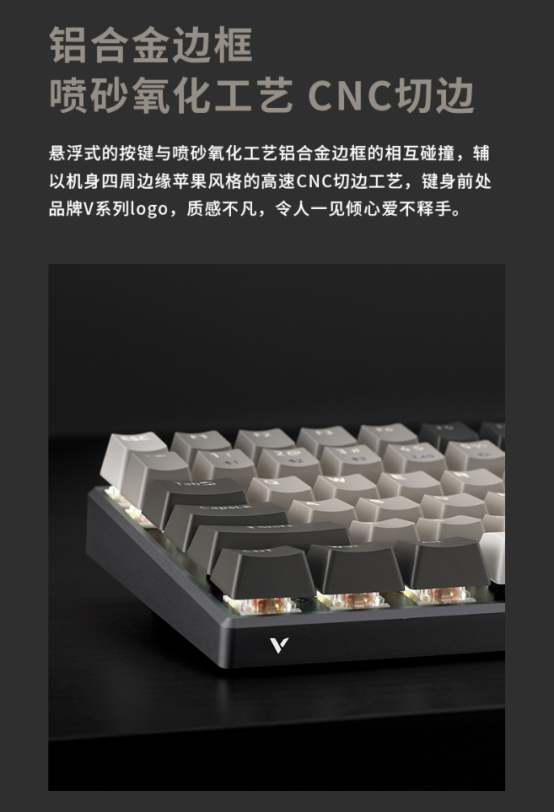 悬挂式按钮与喷砂氧化工艺铝合金边框的碰撞也是无人区的亮点之一。辅以机身周围苹果风格的高速数控边缘切割工艺,键前品牌V系列logo质感非凡,一见钟情。