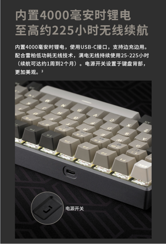 雷柏 V700-8A无人区内置4000mah高能锂电池,采用雷柏低功耗芯片和节能节能技术,全电源无线连续使用25-225小时,可达1-2个月左右,避免频繁充电的麻烦。
