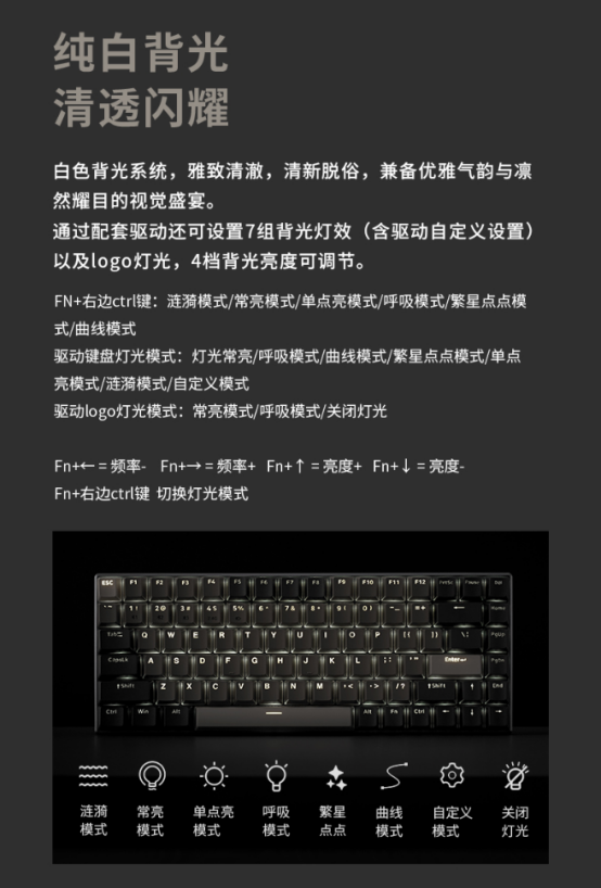 雷柏 V700-8A键盘采用纯白色背光系统,支持7种背光模式,4档亮度调节,还可以通过驱动定制设置和标志照明,既有优雅的魅力,又有令人眼花缭乱的视觉盛宴。