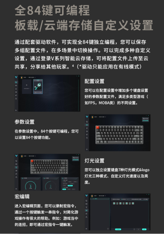 雷柏 V700-8A 84键独立编程可通过键盘驱动软件实现,您可以保存多组配置文件,在多场景中切换操作。通过登录V系列智能云存储,可以完成多种自定义设置,将配置文件上传到云共享,与其他玩家共享。