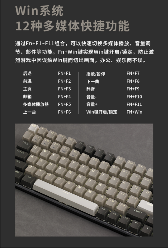雷柏 V700-8A键盘有12个Win系统多媒体快捷键,方便快速切换邮件、浏览器、多媒体播放等操作。