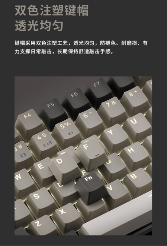 雷柏 V700-8A键帽采用双色注塑工艺,透光均匀,防褪色,耐磨,有力支撑日常敲击,长期保持舒适的敲击感。