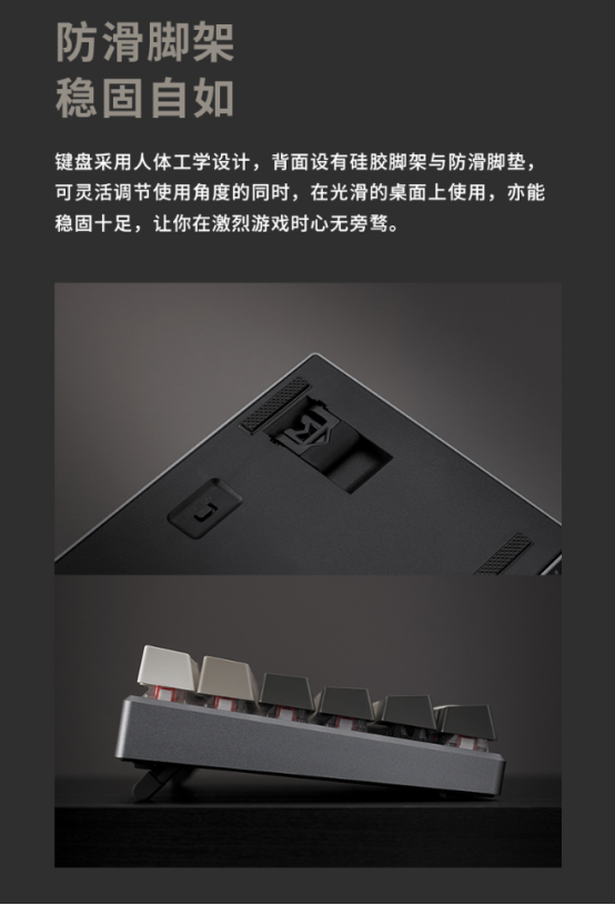 雷柏 V700-8A键盘采用人体工程学设计,背面有硅胶脚架和防滑脚垫,可以灵活调整使用角度,在光滑的桌面上使用,也可以稳定,让你在激烈的游戏中不分心。