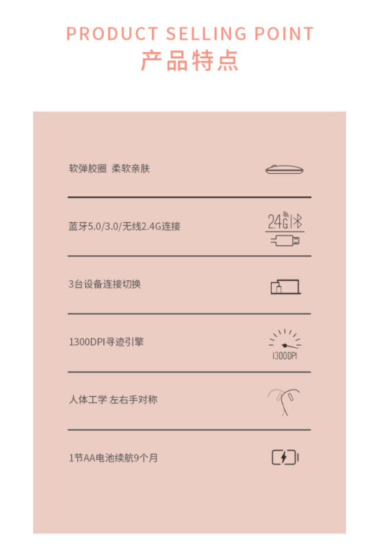 鼠标1300DPI搜索引擎,反应灵敏,用于皮革、布料、纸张等表面,也能准确定位,让您随时进入工作状态。