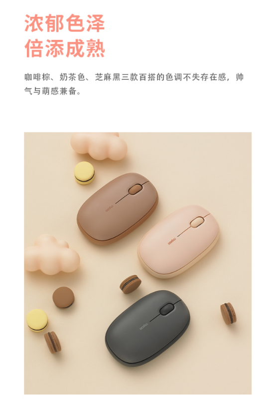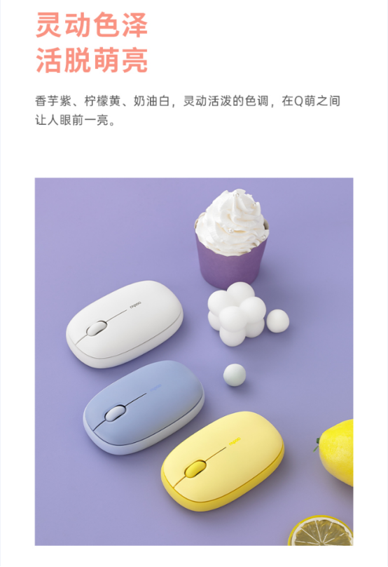 雷柏 M650多模无线布丁鼠标有7种颜色,清新酸甜可爱的桃粉;浓于成熟咖啡棕色、奶茶色、芝麻黑色;灵活的红薯紫色、柠檬黄和奶油白色,温柔,英俊,Q可爱。