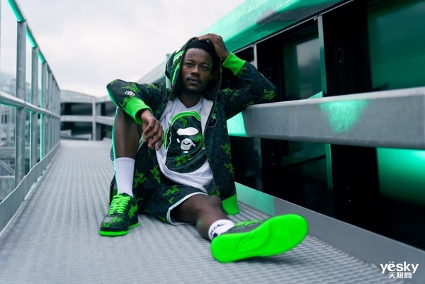 这双运动鞋会在雷蛇绿中闪闪发光,散发出三头蛇标和BAPE黑徽和迷彩印花设计。