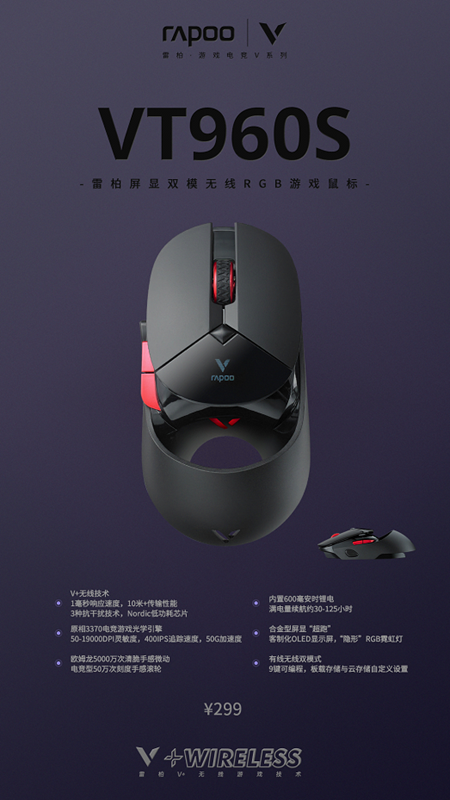 雷柏 VT960S双模无线超跑游戏鼠标。
