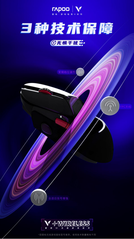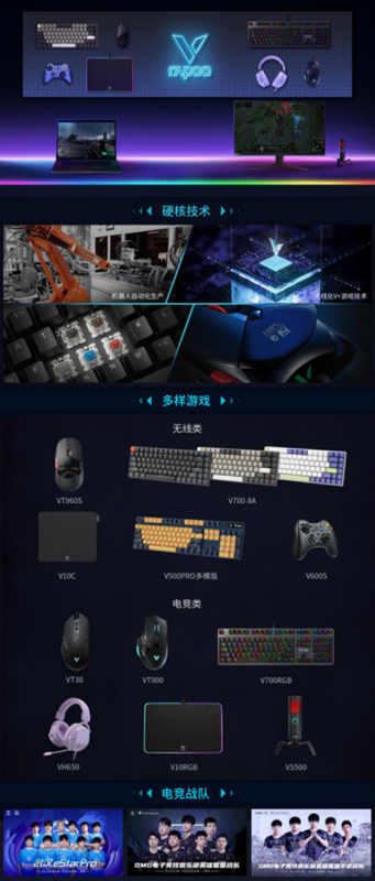 以技术研发为核心,以市场需求为指导,凭借强大的研发实力,独立开发定制雷柏轴、雷柏微动、游戏芯片等核心产品部件。Qi无线充电、OLED显示屏、防水防尘、板内存、云存储等个性化功能,解决了玩家需求的痛点。V+无线游戏技术提高了优化电池寿命、低延迟、抗干扰、使用距离,探索了电子体育的未来。
