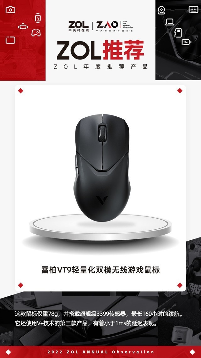 2022ZOL年度推荐产品雷柏 VT9轻量化双模无线游戏鼠标。