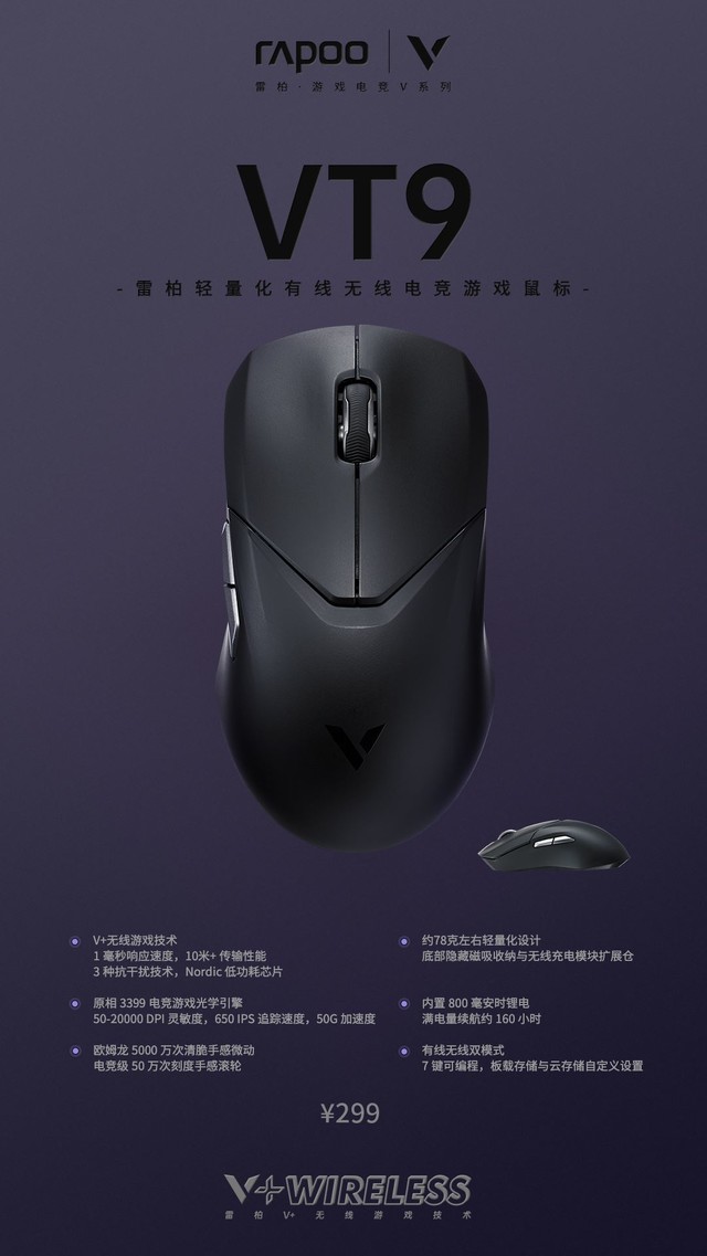 用轻量化放大玩家的体验快感,用技术性能来保证玩家的精准微操作,强强联手,雷柏 VT9轻量化双模无线电竞游戏鼠标,轻量化规则的普及定义。