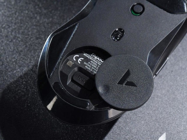 这款鼠标的2.4GHz无线接收器储物槽设计在底部,并采用圆形磁性仓盖。这个仓盖的设计类似于罗技GPW,所以我们当时也推测雷柏会推出这里安装的无线充电模块。