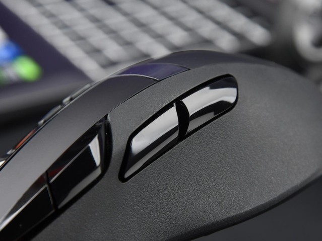 鼠标左侧提供四个侧键,分别分布在左中上部和主键左侧,适合FPS游戏,也适合MMORPG游戏。我们可以使用驱动来定制自定义功能。侧裙上的两个侧键位置适中,手感一致度高,回弹清脆;主键左侧的两个按钮也可以保持相同的手感和快速的响应,这与VT350相比是一个很大的进步。一举解决侧键空键程和触底柔软的问题,请点赞。