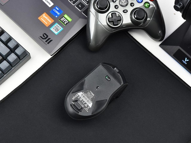 这款鼠标底部提供了4个特氟龙脚贴,并提供了额外的脚贴替换,我们不用担心使用寿命。底部设计了VT350S的2.4GHz无线接收器储物槽和电源开关,非常方便我们找到,也有利于外出携带,防止2.4G无线接收器丢失。