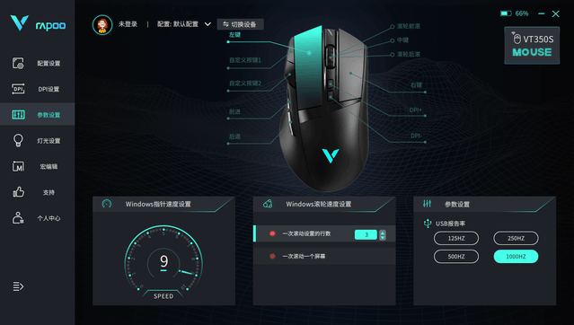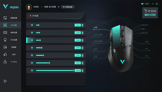 雷柏 VT350S配备了驱动。在官网上,我们也可以看到,雷柏今年的新鼠标几乎被整合到同一个驱动软件中,而不是像以前那样单独为每个鼠标准备驱动。同品牌多设备驱动软件也是目前的大趋势,雷柏在这方面有所改变,也是一个进步。该驱动器可以调节鼠标性能参数、按键功能和宏命令输入。驱动的一级界面非常简单,所以我们可以很容易地找到我们需要的功能,学习成本低。