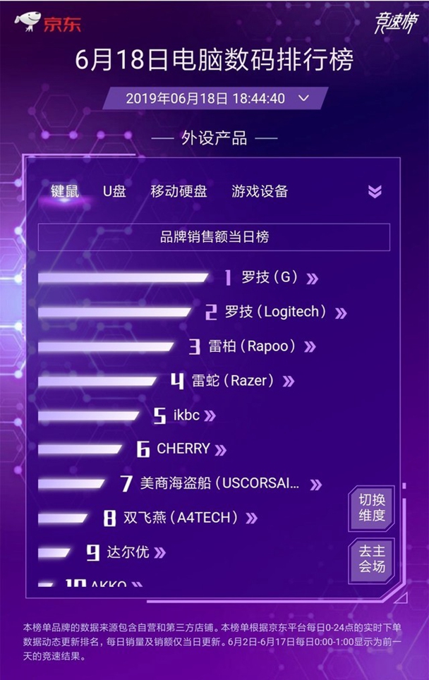 ITCN消息截止至6月18日下午七点,京东键鼠外设销售额排行榜信息更新如下,罗技外设独占榜单前两位。