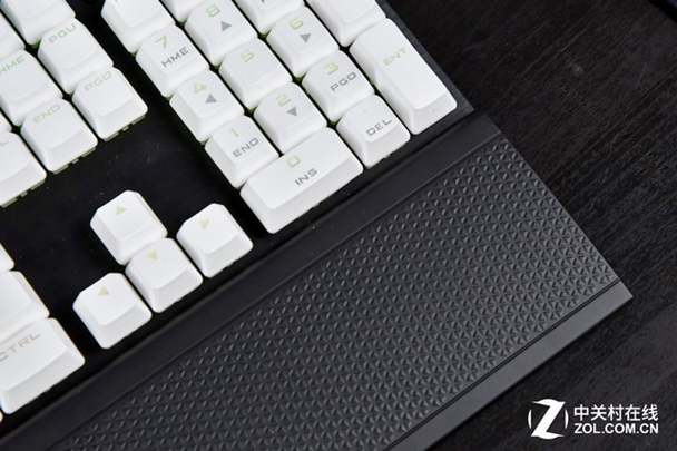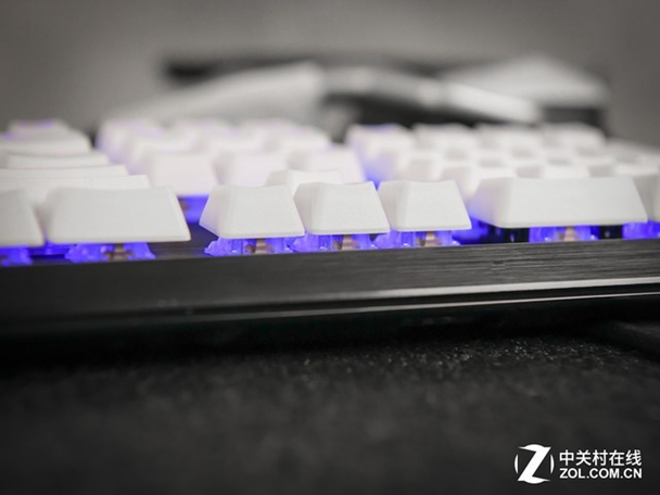 键盘主体区域,标准的全尺寸设计,轴体上采用CHERRY MX 银轴,无需多言;在键帽上,采用白色PBT材质,强度高、不易形变,即使在高温下也不容易变化,抗老化效果非常理想,也不容易打油,是目前键帽领域最受欢迎的材质;