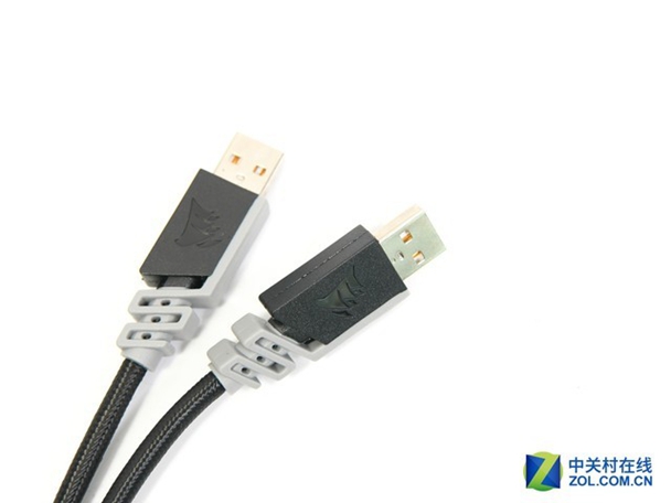 在连接上,采用双USB连接线,一条USB连接线上设计有USB键盘连接器和USB连接器,同时在键盘端还涉及了USB插孔,用户可以把耳机、U盘等支持USB接口的设备直接通过键盘和电脑进行连接,而无需其他操作。