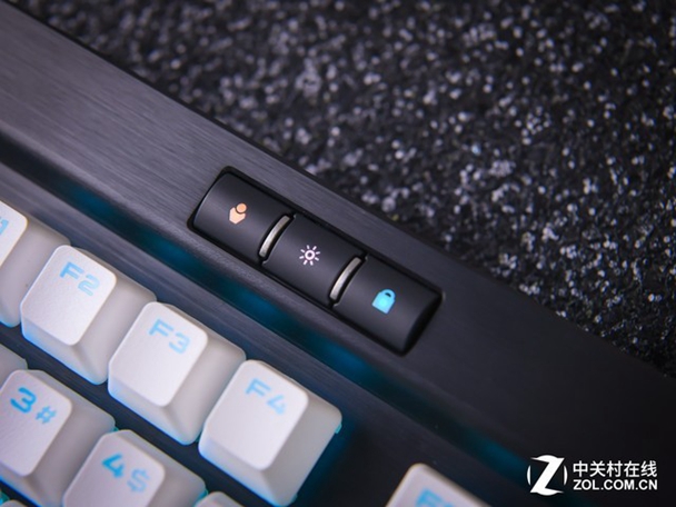 在实体按钮设计上,键盘左上沿设计了3个一排的按钮,分别为设定档切换键、背光亮度键以及游戏玩家专属的Windows键停用键,这三个键的设计十分实用,切换键可以切换不同的灯效模式,其中板载三个默认灯效设定,分辨为螺旋彩虹、雨水以及彩虹波浪,当然了用户可以通过美商海盗船ICUE灯效软件进行自定义设计。