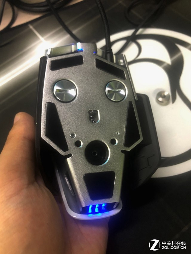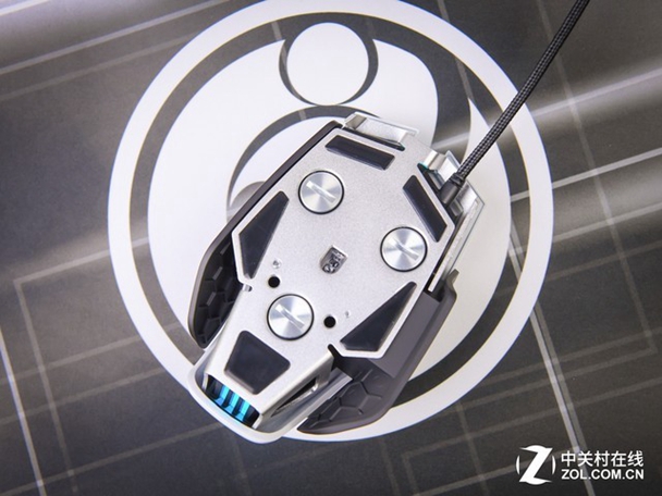 在鼠标的底部,设计了三大配重区块,用户可以根据自己的操作习惯,进行配重选择。需要注意的是,配重区域的操作需要借助相应工具进行操作。根据官方提供的信息,此款鼠标最大配重是115g,而最小配重则是97g左右,总体来看,还是比较适合于手轻的用户进行使用。