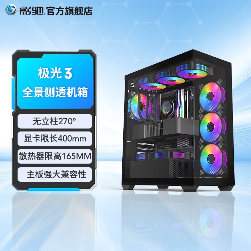 影驰 极光3 台式机电脑海景房机箱 双面钢化玻璃/无立柱/侧板卡扣快拆/支持E-ATX主板360水冷/10风扇位 极光3 黑色 /多面防尘网