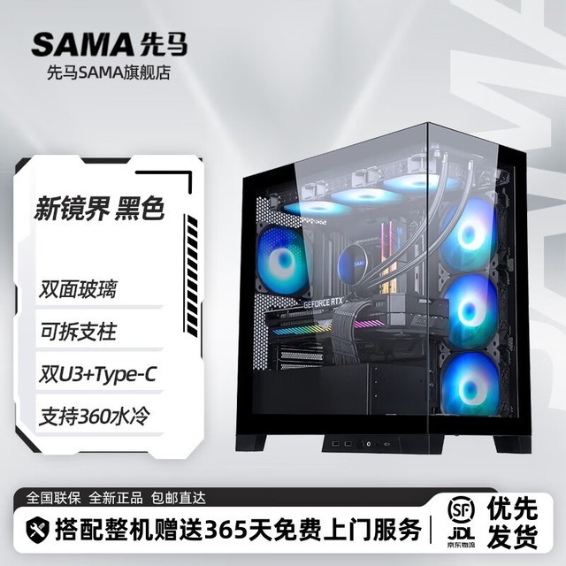 先马 新镜界海景房机箱台式机 双面玻璃/可拆支柱/双U3+Type-C/支持背插主板360水冷 新镜界 黑色(海景房机箱)