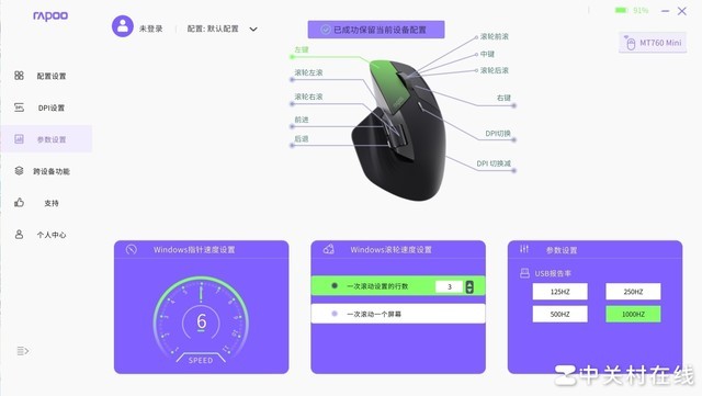 下面我们来看一下雷柏MT760和MT760 Mini鼠标使用的RapooOfficeDev驱动软件,在DPI设置界面中默认800-4000的7档调节,支持50步进调节,细节拉满。