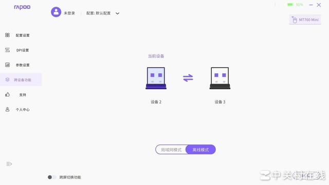 跨设备功能中,离线模式使用插入额外的接收器,完成对码后,点击中间的切换按键切换设备了,并且将光标移动到屏幕边缘即可跨屏使用。