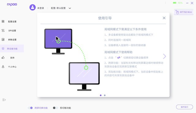 局域网模式中,需要多台设备和驱动处于同一局域网下,并且连接同一设备的接收器,点击切换按钮即可切换设备顺序实现跨屏,局域网中也能共享粘贴文本和图片。