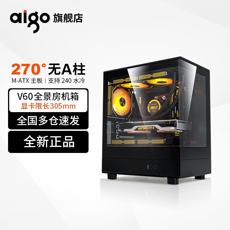 爱国者 V60 海景房机箱全景无立柱MATX高颜值240水冷台式电脑台式机主机箱 黑色(显卡限长305mm)
