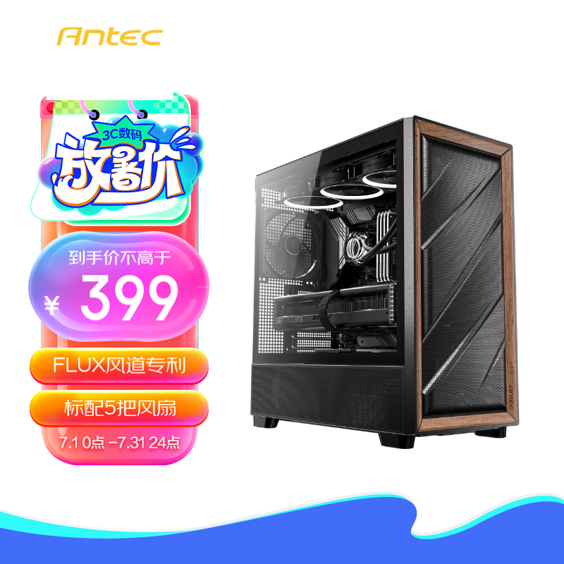 安钛克 FLUX机箱电脑主机玻璃侧透/实木外观/强劲散热/FLUX风道专利/标配5把风扇 /双位360/E-ATX