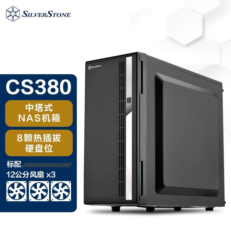 银欣 CS380B ATX机箱,黑色非侧透设计,现正参加满额优惠活动,原价789元的商品现在只需779元即可购买。银欣 CS380B机箱内部空间大,支持ATX主板和多款散热器,显卡限长241mm,电源限长250mm,可兼容长度241.3mm,宽度149.8mm扩充卡。机箱提供两个5.25英寸磁盘架以及8个热插拔3.5英寸硬盘位,并配备了两个12cm侧边风扇和一个12cm背部风扇。这款机箱尺寸为215.3*426.5*487.5mm,外观简约大方,性能强劲稳定。