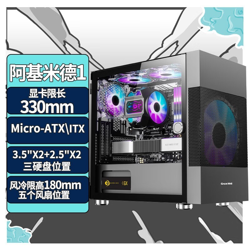长城 阿基米德KM-1黑色电脑机箱(超宽体/MATX小板/240水冷位/玻璃全侧透/20CM风扇位/4070显卡)