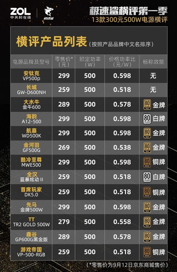 参考ZDC调研中心发布的2020年上半年数据,极速鲨市售电源抽检横评的第一季我们选择了关注度最高的500W,价格控制在更受玩家欢迎的250元-300元,最终选出13款500W电源,列表如下(按照品牌中文名音序排列)。