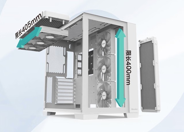 不仅内部空间充裕,航嘉 阿波罗麦克斯非常注重细节和创新设计,采用了左右分层散热设计和全新独立风道,机箱配件和电源独立散热,可以有效隔离热量,带来更佳的散热效果,也更方便走背线。同时,机箱顶置和侧置都支持双360水冷散热器的安装,还提供了多达10个风扇位,助力玩家打造更科学的风道,从而进一步提升散热性能。