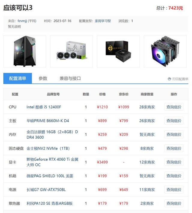 我们今天看的这个配置单名叫“应该可以3”,总价7423元,考虑到部分硬件有优惠,实际上到手的价格大概是7000元,i5-12400F搭配RTX 4060Ti整体上还是偏向游戏的一个配置,其中电源的预算有些太高了,我们具体来看。