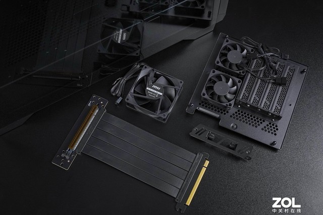 显卡竖装的套件,包括可替换PCIe挡板和一组PCIex16转接线。为增强散热效果,大家可以购买两个6015黑色风扇和1个8025风扇与之搭配使用。(图中的三个风扇及PCIe竖装线非随机标配)