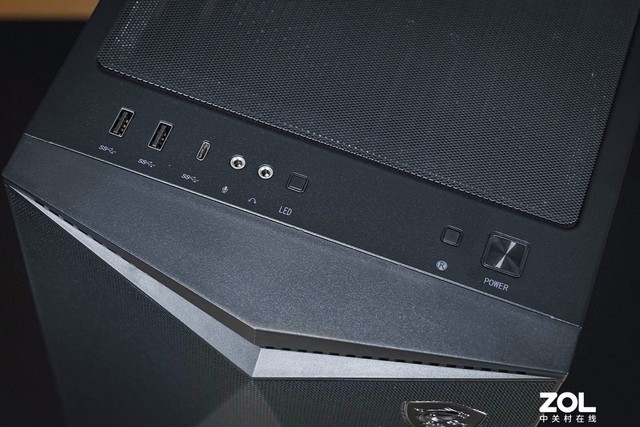 前部接口按键在顶部前侧,配备2个USB3.0、一个Type-C、一组3.5mm耳机和麦克风音频接口,音频接口旁边是LED灯效切换开关,按一下即可改变不同的灯效。电源和复位按键靠近右侧,轻触开关手感非常不错,电源和硬盘指示灯内嵌在电源按键外圈的灯环中。