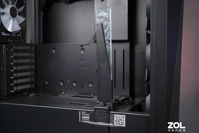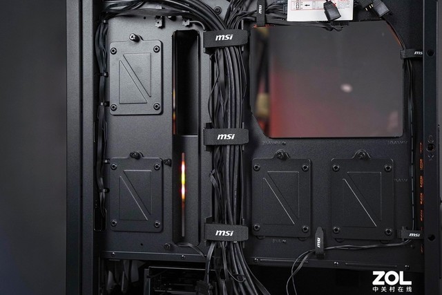 得益于较大的内部空间,微星 氪金枪3操作起来比较得心应手,主板的螺丝位也比较精准,独立走线孔在降低走线难度的同时,也可以实现更加清爽的视觉效果。安装好主板后,可见机箱内部空间依然十分充裕。