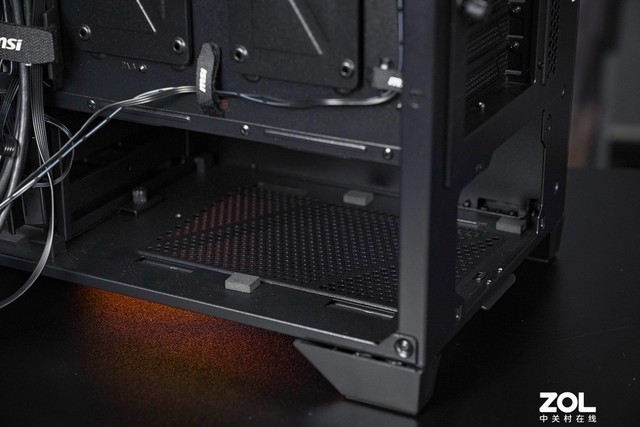 下部是电源和3.5寸硬盘的安装仓位,上面有大面积的通风孔提高底部冷空气的进入效率。底仓有着充足的空间,方便玩家安装加长机身的高功率电源。