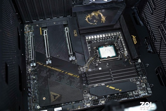 本次装机我们可以说是打造了一套微星“全家桶”,主板选择微星MEG Z790 ACE,采用EATX架构,支持Intel第13代酷睿处理器、DDR5内存和PCIe5.0设备。主板表面覆盖大面积散热装甲,并内嵌ARGB灯效,视觉冲击极强。