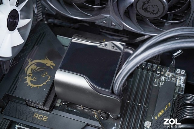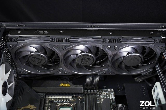 散热器选择了微星MEG CORELIQUID S360高端360mm一体式水冷,方形的水冷头内嵌了LCD显示屏,可显示CPU温度、冷却液温度和风扇转速等信息,散热风扇虽然不带RGB灯效,但是粗壮的电机和较多数量的叶片,典型的高风量低噪音产品。