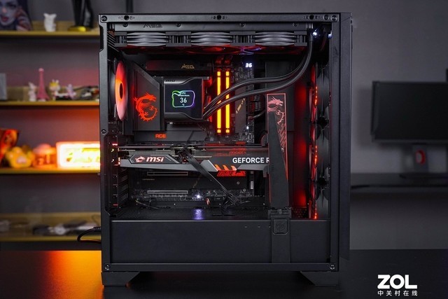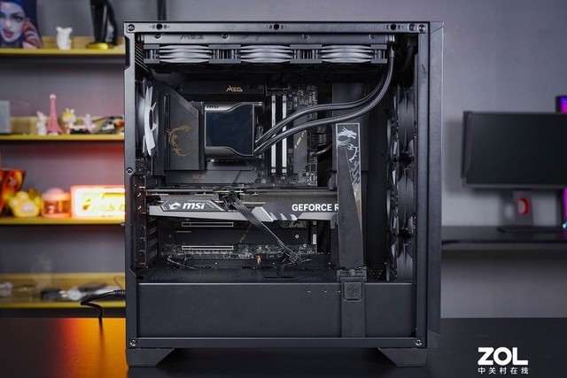 微星 氪金枪3支持顶部或前部安装水冷排,推荐安装在顶部,前面板安装RGB散热风扇,这样会有更好的视觉效果。如果是前置安装水冷排,记得要将水管方向向上。
