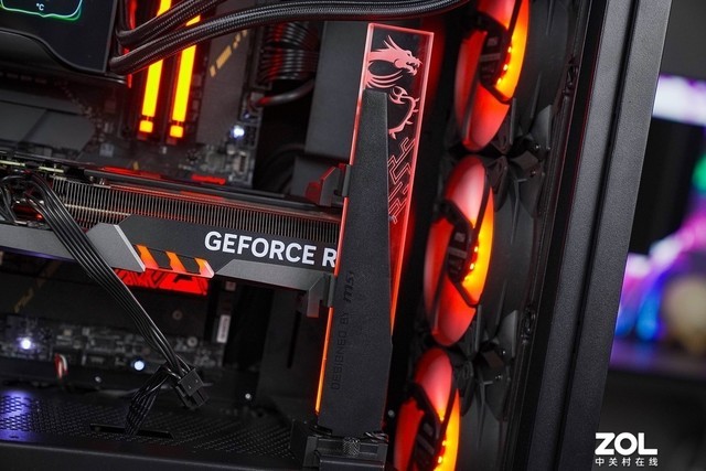 显卡支架内嵌一块厚实的钢化玻璃,并用镭射雕刻出微星的龙图腾,通电后在ARGB灯效的映衬下,呈现出更加绚丽通透的视觉效果。