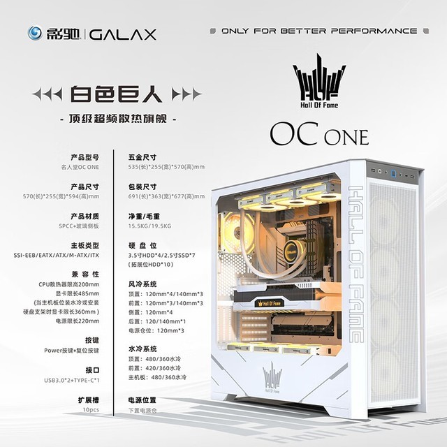 影驰 名人堂 OC ONE 玻璃侧透全塔机箱/支持EATX主板/双480水冷 电竞游戏机箱 名人堂 OC ONE